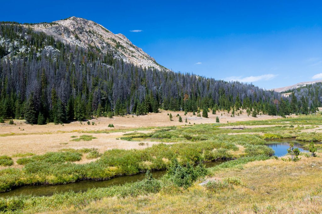 You’re soon immersed into the large valley you’ve been getting glimpses of far above. One lengthier creek crossing opens up the views and begins to guide you through a vibrant valley. Small willows lining the creek in the middle are sandwiched by larger evergreen forests on either side as the valley extends into the western horizon. You’ll notice the creek slows down substantially as it flattens out. You may also notice a rather euphoric level of silence.