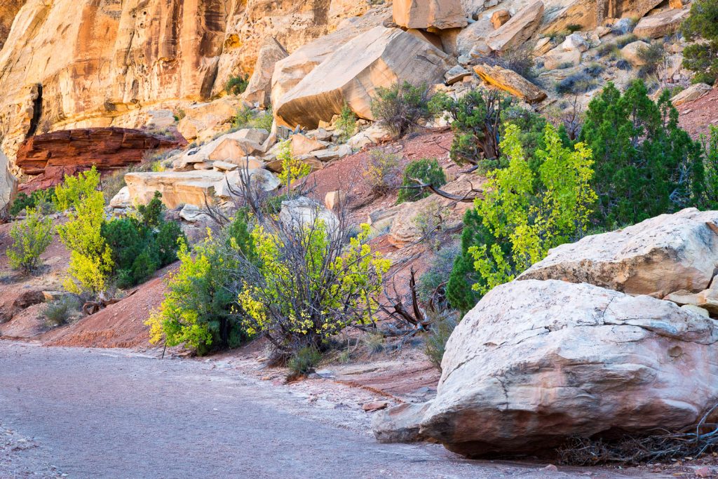 Bell Canyon continues its ascent, through one narrows after another, until the canyon widens one last time. This brings you out to the Behind-the-Reef Road which the trail joins for a brief climb. While you may not have found yourself dehydrating as easily in the canyon due to its relative coolness, that quickly comes to an end on the connector trail. The hike up the road is steep and is completely exposed, so those warm fall or spring days will catch up with you quick. This (among many other reasons) is why you should have plenty of water with you.
