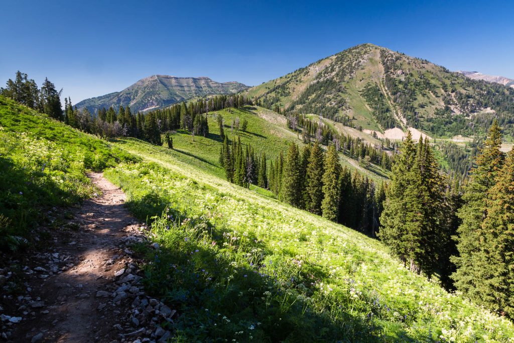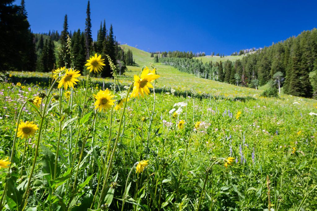 At roughly 3.4 miles in, you’ll emerge from the forest into a large and steep meadow where the trail begins ascending up a steep series of switchbacks. Increasingly stunning views over the southern end of Jackson Hole encourage brief respites to catch your breath, while, if timed properly, wildflowers burst across the landscape in all shades of color.