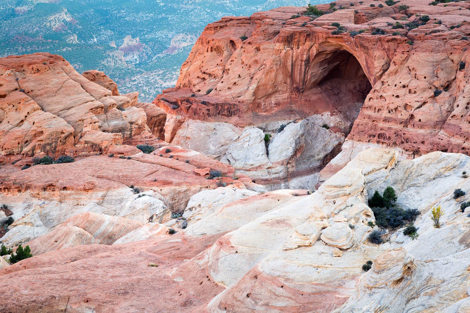 The cairns wrap around the slickrock and as you approach a relatively smaller one, your eyes adjust to see the massive Cassidy Arch right in front of you, overlooking a sandstone abyss falling far below the arch. The ledges around it are steep so watch your step, but (safely) nearing the edges will put the height into perspective. You can also head just a bit farther to the south to see the Scenic Drive Road down below as well, dwarfed by the Waterpocket Fold and the massive wingate sandstone cliffs far above. Looking down below and seeing nothing below you may put a slight weakness into your knees though. Even so, it’s hard not to admire the views overlooking the vast desert landscape so much that you begin to forget there’s a majestic arch right behind you.