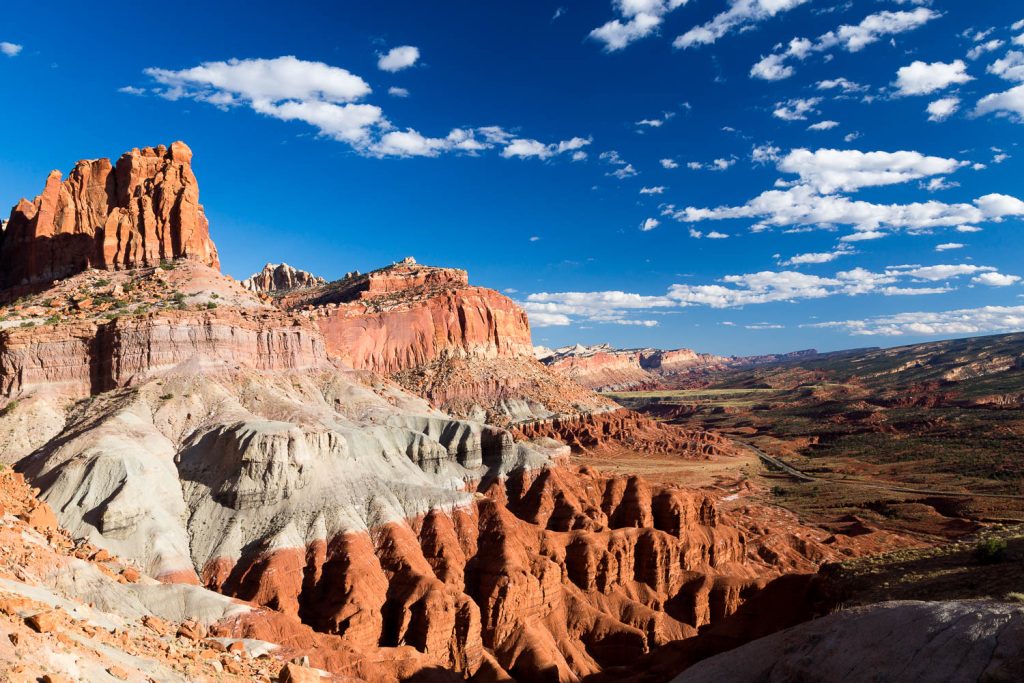 After rejoining the trail, another climb begins. It only takes a short distance though before you’re rewarded on this one. Topping out at a switchback, an incredible view of the Waterpocket Fold is revealed, capped with the Navajo Knobs in front of you, and stretching for dozens of miles to the south.