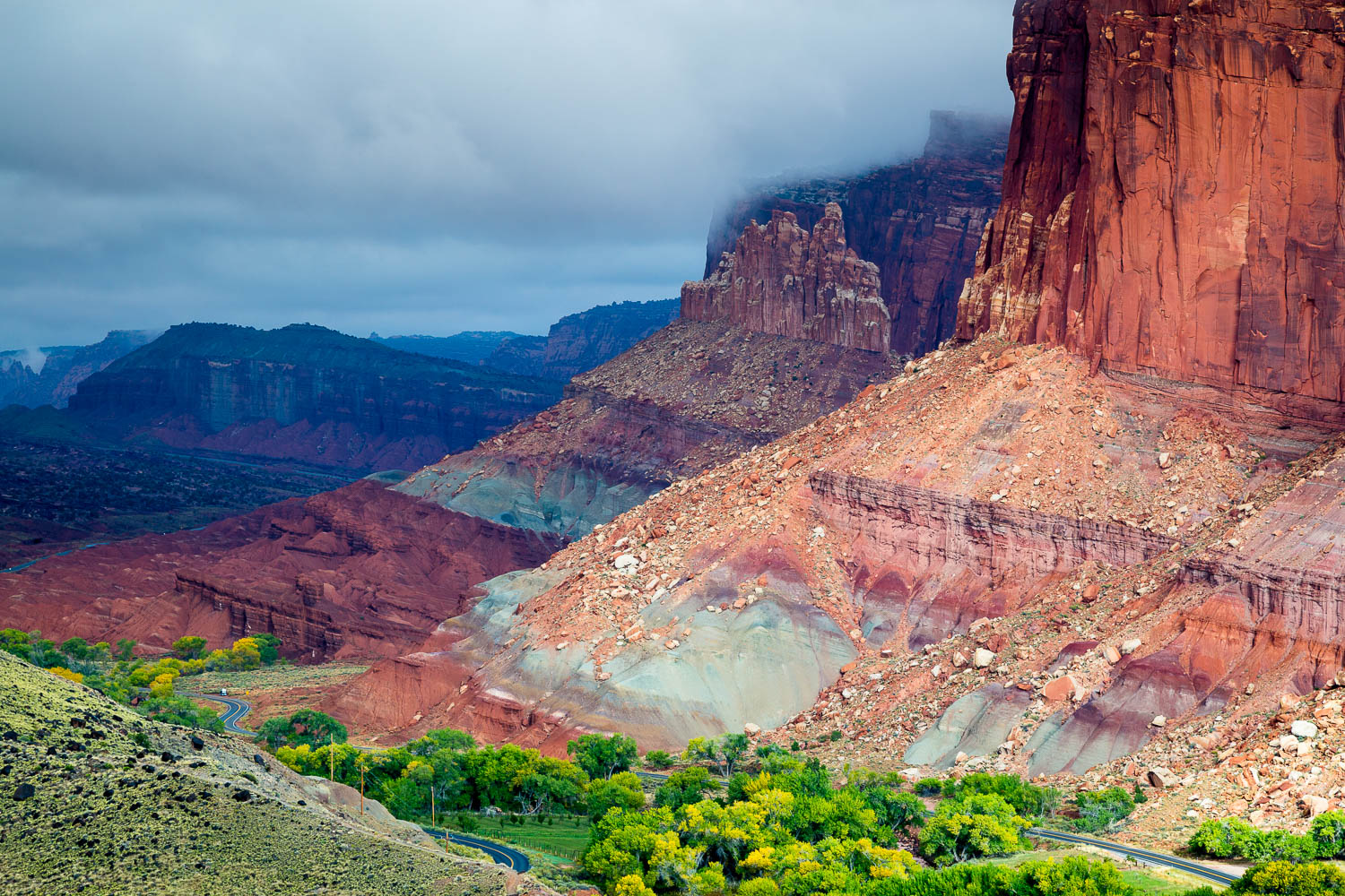 The trail begins near the south end of the s-curve along the scenic drive, also just south of a parking area if you’re not staying in the campground. The trail climbs steeply for about .5 miles, showing off impressive views of the Waterpocket Fold before entering Cohab Canyon.