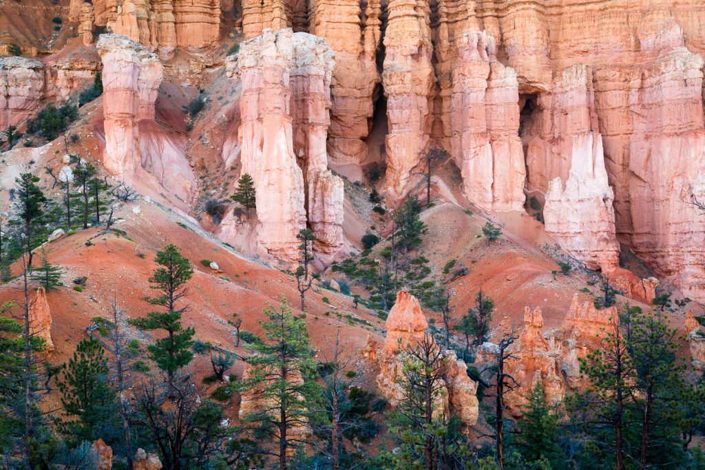 Showing off Bryce Canyon’s signature colors, you meander down hills and in and out of hoodoos found throughout the canyon, which at this point has widened a great deal. At about 2.25 miles, the trail will appear to fork as you begin to climb up a hill. The main trail goes right, while a spur trail to an overlook heads left. The overlook spur begs to be checked out, though unfortunately, it’s not quite as interesting as its buildup would have you believe.