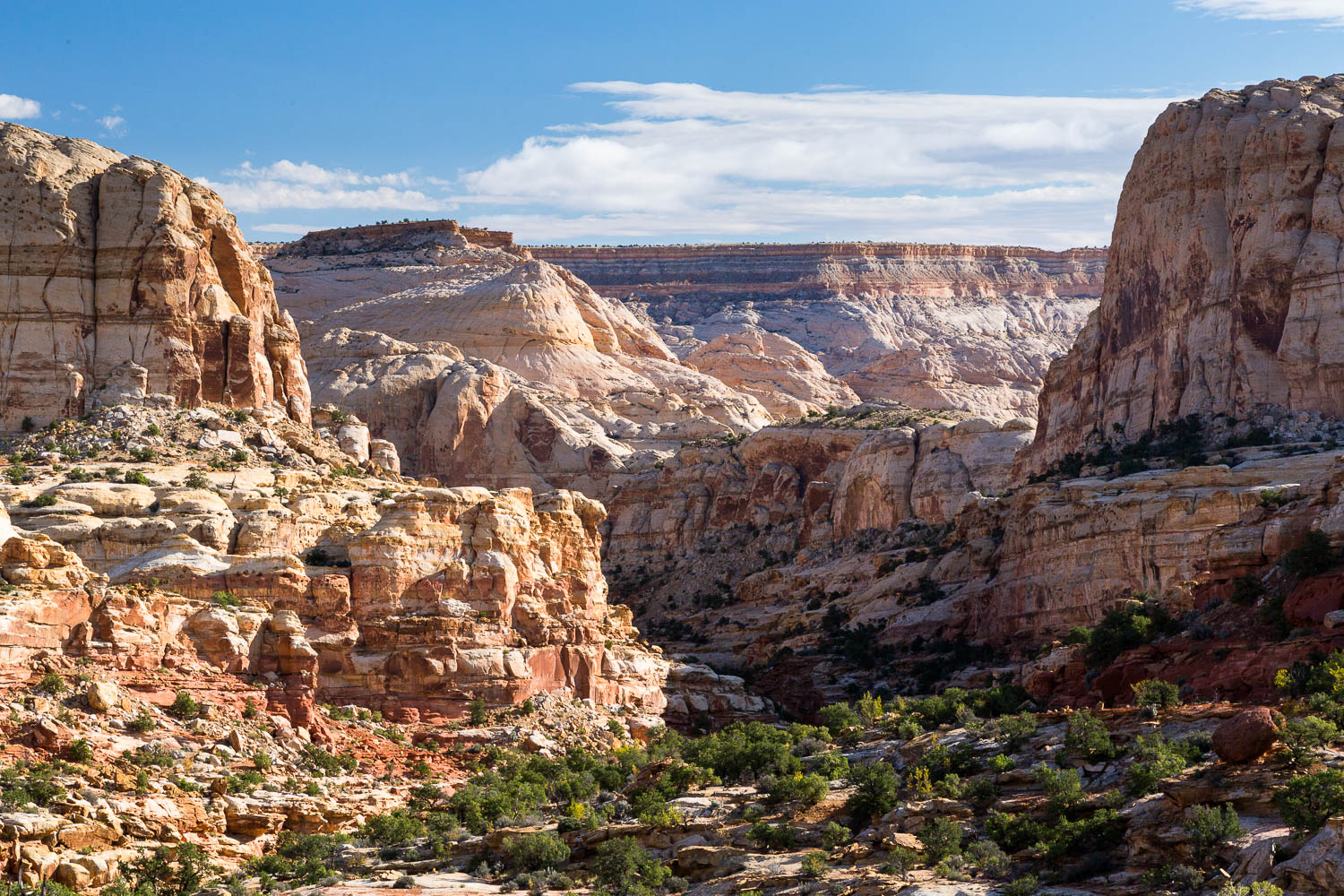 After ascending a bit higher, you’re treated to fantastic views of the Navajo Sandstone capping that area of the Waterpocket Fold, visible for miles around. You then reach a crest where a large and carefully balanced rock escorts you around into another canyon.