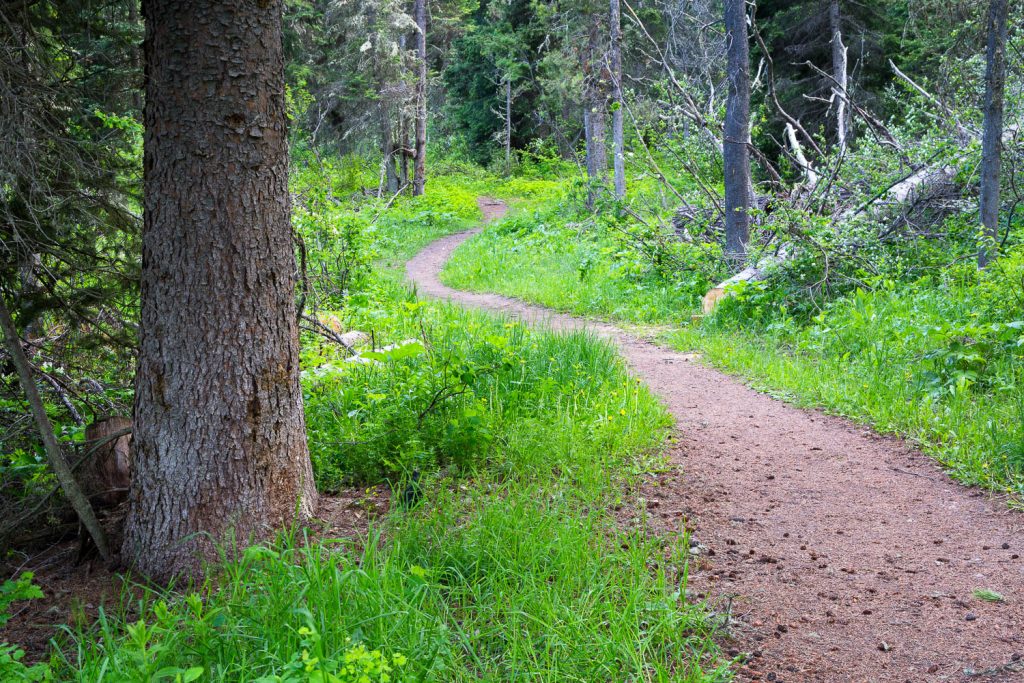 You’ll wind up through the meadows and woods and reach a pair of footbridges that cross a scenic stream. Shortly after you’ll connect with the Crater Trail at 1.25 miles in. Continue straight where you’ll maintain the peaceful pattern of beautiful meadows and old evergreens. It’s also through here that you’ll notice you’re moving away from the creek.
