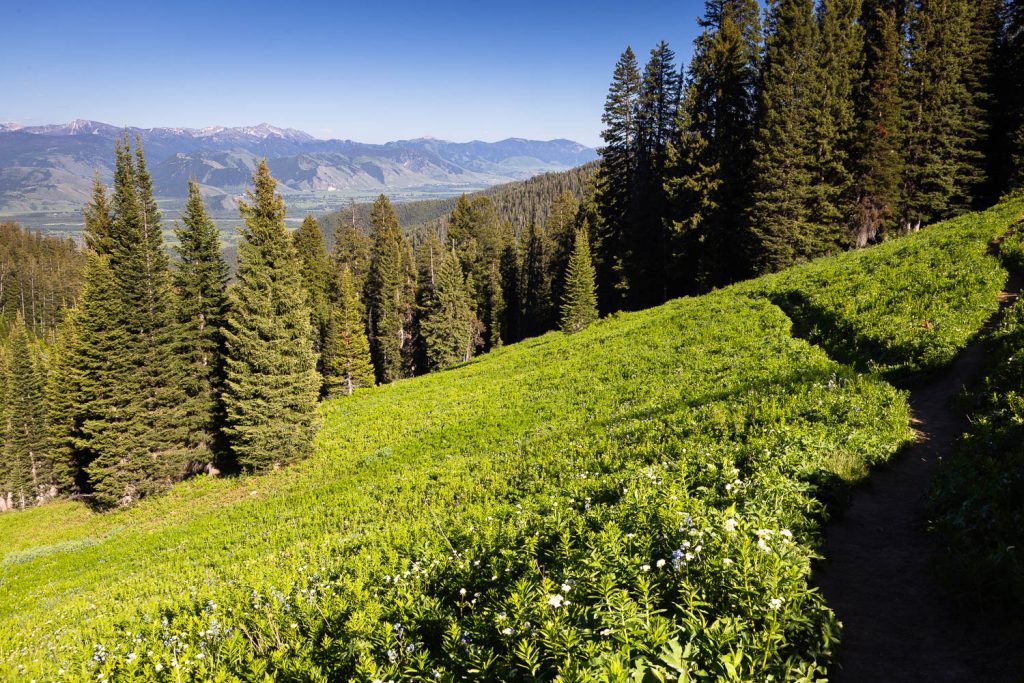 You’ll soon climb back into a sparse forest as you wind around a large hillside. In the distance Jackson Peak and the southern Gros Ventre Mountains rise above the trees. You’ll wind in and out of meadows as the trail continues wrapping around the hill. With the sound of the rush of the creek below, you’ll make a small creek crossing before passing under the power lines once again.