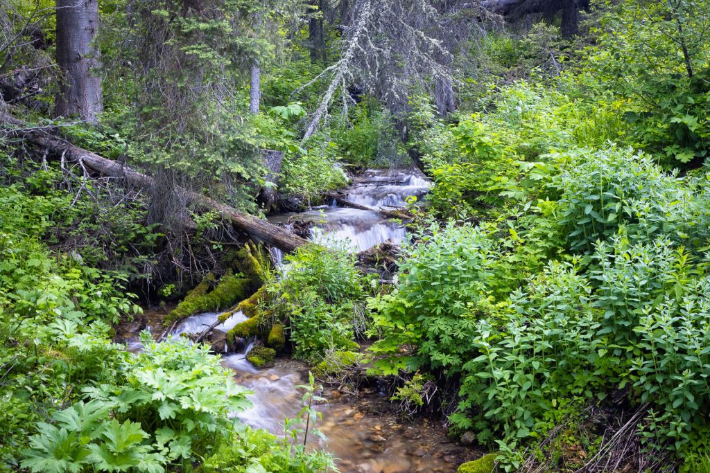 Beyond the kiosk the trail climbs up into an old forest. You’ll cross over a creek and ascend in and out of lush meadows and the mature woods. Below and to the left Trail Creek rushes at the bottom of the canyon.