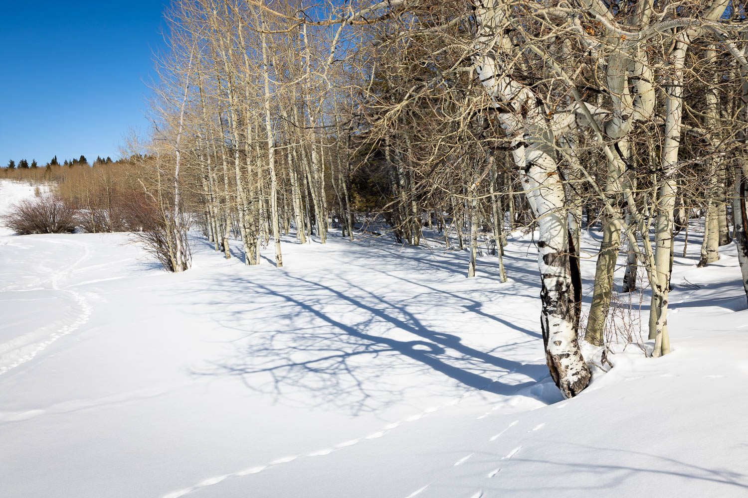 Continuing the climb up toward Mud Lake, Taylor Mountain will soon pop up over the eastern horizon. Nearing the top, the trail levels out where hillier western foothills of the Teton Mountains become the dominant landscape. It’s shortly after that you’ll pass through a gate where Mud Lake rests among large aspen groves just beyond. Thanks to its placement in the hills, the noise of Teton Valley quickly fades away and a silent landscape awaits in a peaceful and relaxing setting.