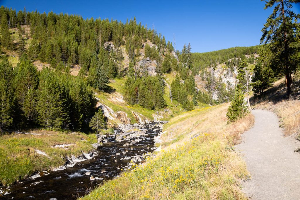 As you begin up the trail, you’ll quick cross the Little Firehole River as you make your way through a clearing. Off to the right, steam from thermal features at Biscuit Basin can be seen. Shortly after, you’ll head back into the forest. After a bit of meandering, you’ll connect with the back of Biscuit Basin at 0.4 miles in. The trail will bend westward here as you head deeper into the forest.