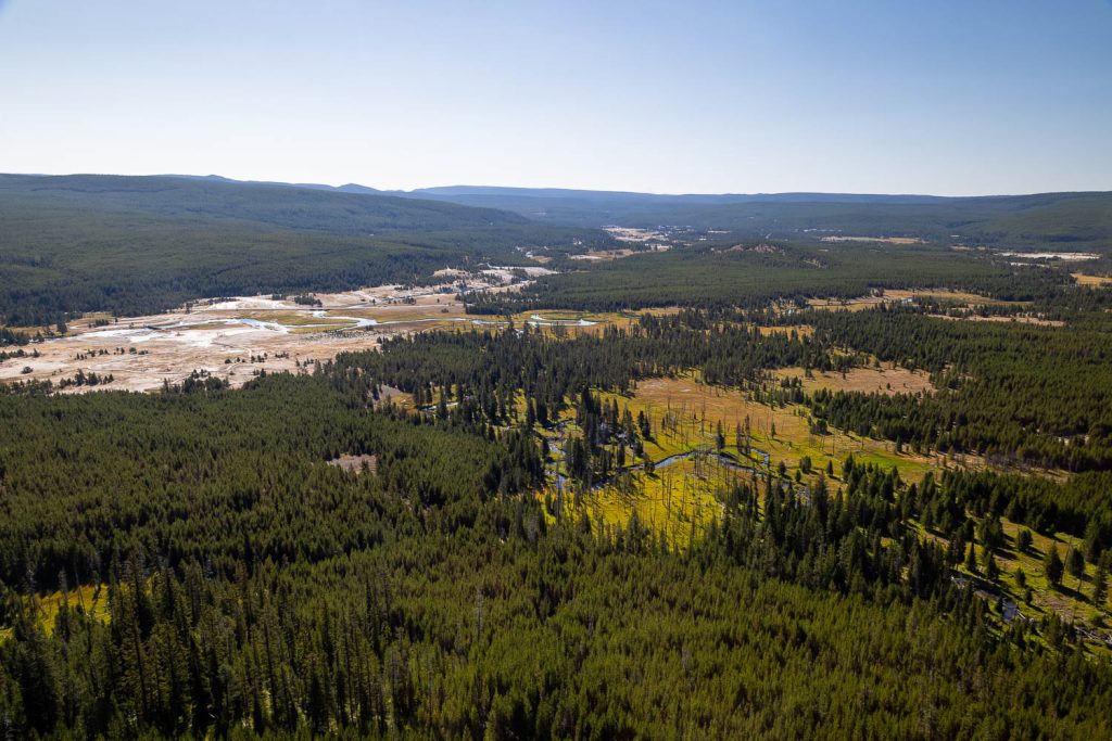 From the junction, you’ll descend through the forest. Along the way, an occasional view of the Upper Geyser Basin can be seen through the trees. The easy hiking weaves through the forest, ultimately dropping down to the overlook, marked by a wooden fence. Below are absolutely gorgeous views of Biscuit Basin and the Upper Geyser Basin. It’s a very welcoming place to stop and relax from the previous climb and to appreciate the view. When ready, continue down the trail.