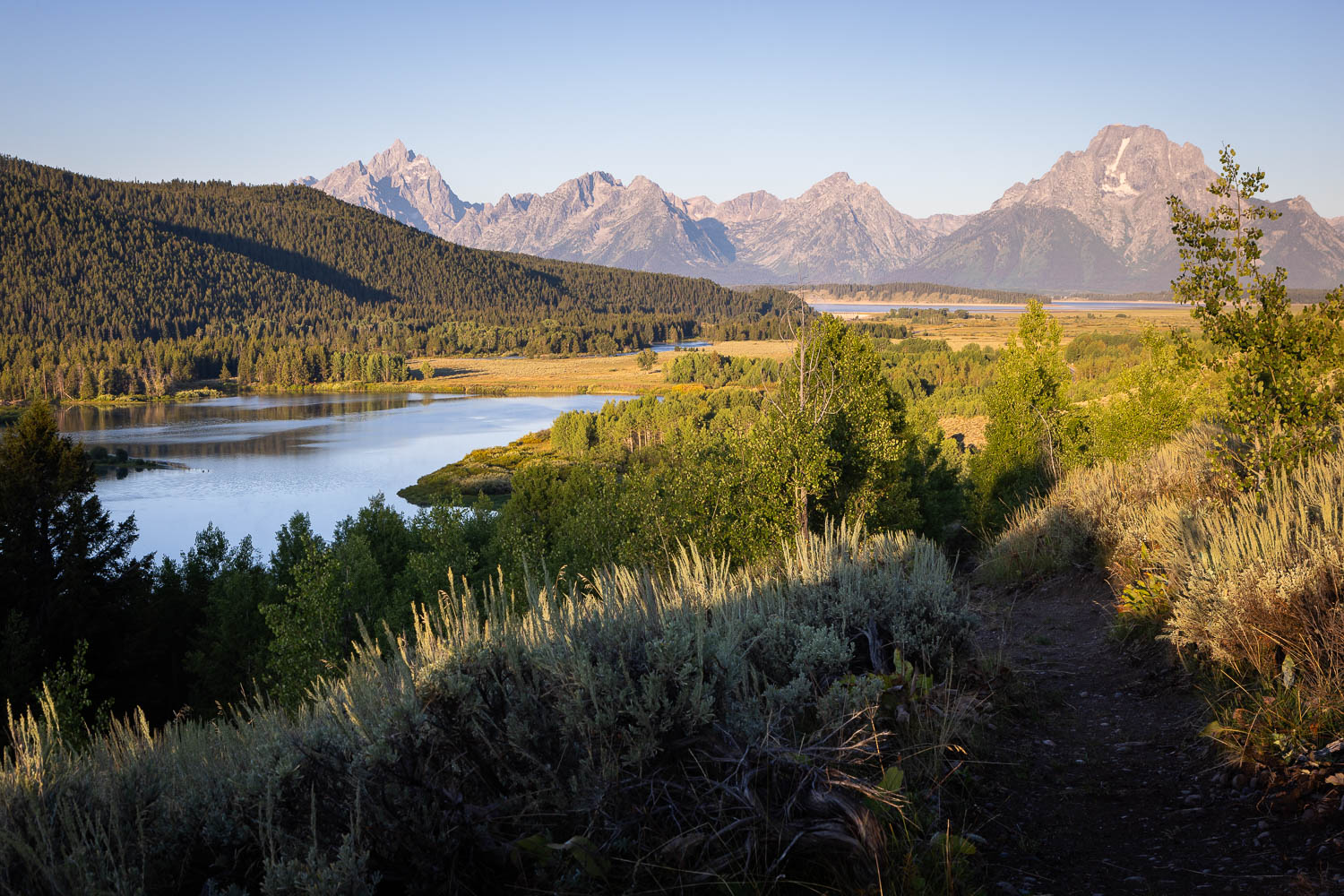 From Jackson Lake Lodge, follow the trail under the Christian Creek Bridge, emerging into a large field of willows. Follow the trail and at the junction just beyond the bridge, head right and drop down into the willows. The trail will meander through the dense vegetation before climbing up a hill where Christian Pond will lie below. The surprising pond rests tranquilly below the trail, most drivers within ears shot oblivious to the serenity and natural beauty lying before you. From the pond, the trail will head into the woods and bob up and down over small hills before reaching another junction. At the junction, head right to proceed to the Oxbow Bend Overlook.