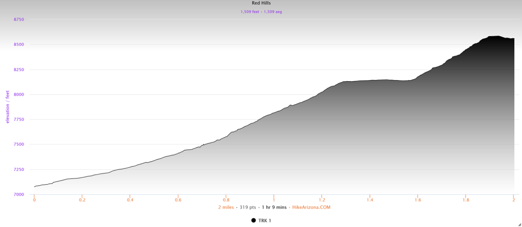 While the trail climbing starts gradually enough, it doesn’t take long before the steepness increases at a noticeable rate. From this point, the trail continues to climb at a rather unforgiving rate. Likewise, many of the views of the sandstone deposits have all but disappeared, leaving you with the northern side of the hills where more vegetation tends to grow, covering up the reddish dirt. Still, the trail continues its steep ascent upward.
