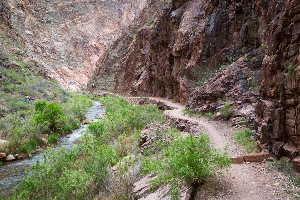 From the Bright Angel Campground or Phantom Ranch, head up the North Kaibab Trail as it ascends into the Vishnu Basement Rocks. The deep, dark towering walls quickly overtake the landscape as Bright Angel Creek begins rushing through the narrow chasm.