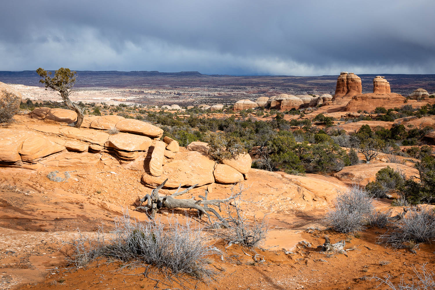 You soon begin hiking along the base of the sandstone buttes and fins that were on the other side of the flat. The trail gets a little more bumpy here as you weave through a small juniper forest and up and down small rises in the sandstone.