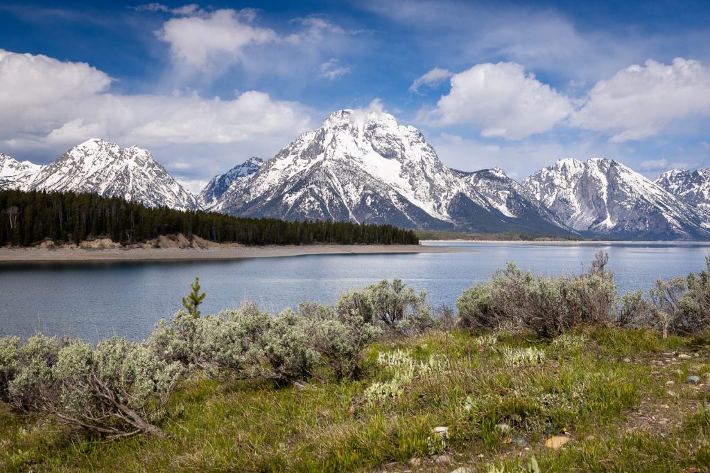 You soon reach the thicker and mature evergreen woods where the trail takes a twisting route downward through the trees, ultimately popping out at one of the campsites at South Landing. Jackson lake extends out from a small bay below, with Mount Moran rising high into the background. It’s a calming and unique view of the lake and a great short but sweet little escape to the lakeshore.