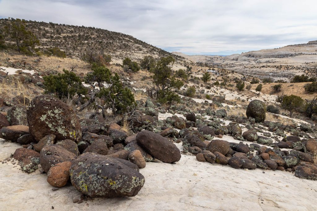 Follow the sandy trail to the edge of the rim and begin your descent down the slickrock sandstone. One of the more unique features of the trail are the lava boulders, brought down from Boulder Mountain by ancient glaciers. Cairns and the occasional rocky outline help guide you down as you transition from slickrock sandstone, to actual sand, and back again (and again).