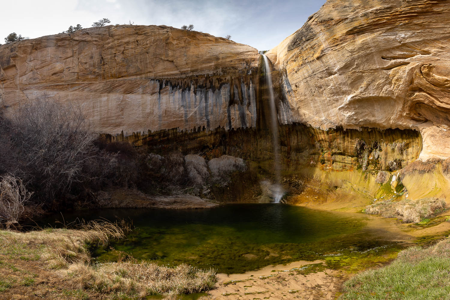 As you near the bottom of the canyon, the trail veers to the right to begin bringing you to the falls. You’ll soon see two cairns in different directions. To reach the bottom of the falls, head left. Follow the cairns and rough trail and you’ll soon see the falls at the end of the canyon just beyond a large cave. The trail winds through thick, lush vegetation to bring you to the base of the falls where a secluded desert oasis awaits.