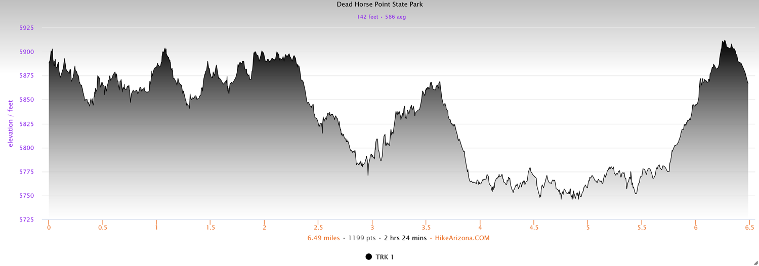 From the Dead Horse Point State Park entrance station, head south for 3.5 miles until the road dead-ends at a large parking area for the namesake of the park. Begin the trail where it wanders around the canopy just inside from the rim.