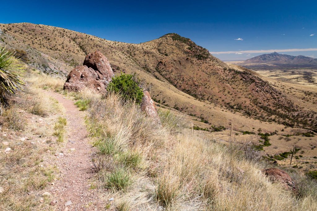 The trail continues to veer more eastward as it quickly meets the terminus of the Joe’s Canyon Trail. Head right to remain on the Yaqui Ridge Trail, and follow as it begins to descend more rapidly down the southern foothills of the Huachuca Mountains. The forests of oak and juniper higher up near the trailhead begin to grow increasingly scarce, dotting the trail with brief respites of shade.